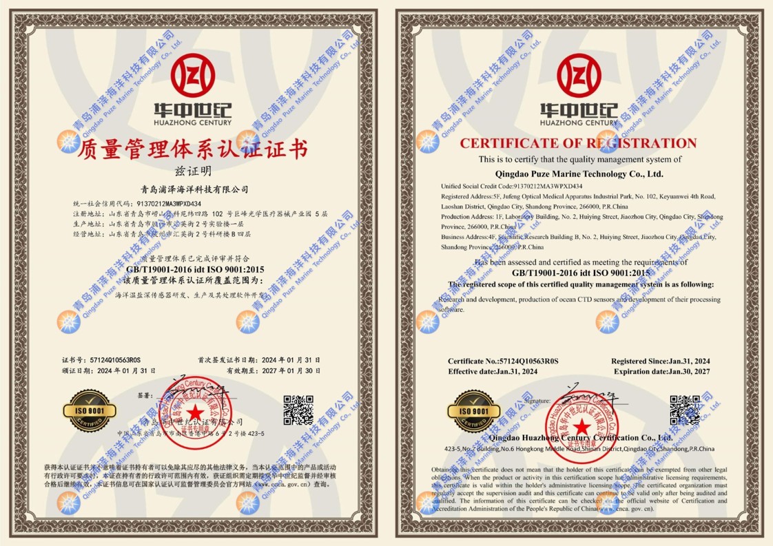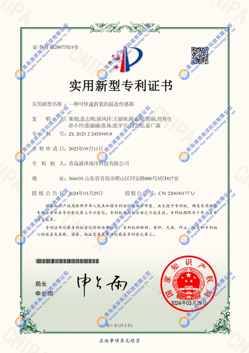 Qingdao Puzhe Marine Technology Co., Ltd., a research achievement transformation company of the Institute of Marine Instruments and Meters under the Shandong Academy of Sciences, was established in 2021 with a registered capital of 40 million yuan, including 10 million yuan from Shandong provincial fiscal special funds and 29.9 million yuan from the valuation of research team achievements. It is a national-level science and technology-based small and medium-sized enterprise, a national high-tech enterprise, and an innovative small and medium-sized enterprise. The company has assembled a senior talent team composed of national-level specially appointed experts and Taishan Series talents from Shandong Province, equipped with advanced R&D and production facilities, ISO9001 certification, and over 20 authorized patents. It has received awards such as the Second Prize of Shandong Provincial Science and Technology Progress, the Second Prize of China Instrument and Meter Society Science and Technology Progress, and the First Prize of Qingdao Science and Technology Progress. The company has developed an independently controllable and domestically unique diamond film temperature-salinity-depth sensor product line, achieving the localization, batch production, customization, serialization, and intelligence of high-performance temperature-salinity-depth sensors. Its products have been widely used and praised by institutions such as Laoshan National Laboratory, National University of Defense Technology, China Ocean University, China Shipbuilding, Shandong Jinghai, and Deep Blue, providing key technological support for the strategy of building a maritime power and global sustainable marine development.